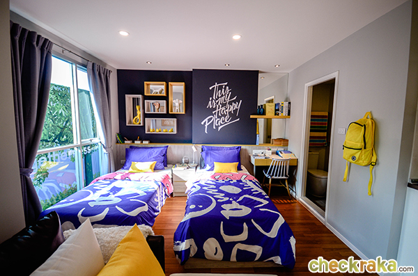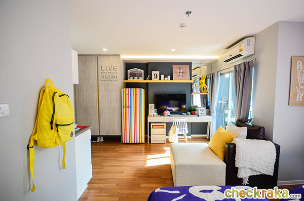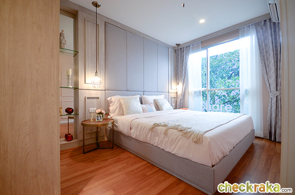 ตัวอย่างห้องนอนในห้อง 1 Bed ขนาด 28.00 ตร.ม. โดยชั้นล่างจะเป็น สำนักงานนิติบุคคล, ลานอเนกประสงค์, ห้องเรียนรู้, ลานฟิตแอนด์เฟิร์ม, สนามสตรีทบาส, ห้องเครื่อง และที่จอดรถ, ชั้น 2 - 4ห้องเครื่อง และที่จอดรถ ,ชั้น 5 ฟิตเนสโซน (สระว่ายน้ำไร้ขอบ, ห้องออกกำลังกาย) และห้องชุดพักอาศัย ,ชั้น 6-18 ห้องชุดพักอาศัย,ชั้น 19 สวนอินฟินิตี้ และห้องชุดพักอาศัย และชั้น 20 ห้องชุดพักอาศัย ภายในโครงการมีที่จอดรถประมาณ 121 คัน (ไม่รวมจอดซ้อนคัน) พร้อมสิ่งอำนวยความสะดวกให้ลูกบ้านที่อยู่อาศัยทำกิจกรรมร่วมกัน อาทิ