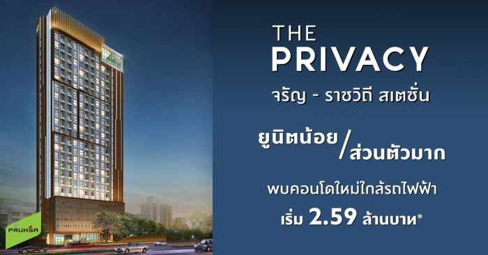 "เดอะ ไพรเวซี่ จรัญ-ราชวิถี สเตชั่น (The Privacy Charan-Ratchawithi Station)" คอนโดใหม่จากพฤกษา เรียลเอสเตท โครงการนี้เป็นคอนโด High Rise 24 ชั้น 1 อาคาร บนเนื้อที่ 1-2-45 ไร่ มีห้องชุดพักอาศัยเพียง 279 ยูนิต ร้านค้า 2 ยูนิต รวม 281 ยูนิต ขนาดห้องพักอาศัยเริ่มต้น 24.50-39.00 ตร.ม. ทำเลใกล้รถไฟฟ้า MRT สถานีสิรินธร ประมาณ 650 เมตร และแวดล้อมด้วยสถานที่อำนวยความสะดวกต่างๆ ทั้ง เมเจอร์, ปิ่นเกล้า, เซ็นทรัล, ปิ่นเกล้า, ฟู้ดแลนด์, พาต้า และโลตัส นอกจากนี้ยังใกล้ รพ.ศิริราช, รพ.ยันฮี และรพ.เจ้าพระยา ในราคาเริ่ม 2.59 ล้านบาท* ลงทะเบียนเพื่อรับข้อมูลเพิ่มเติมได้ที่นี่