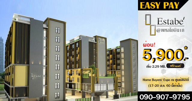 Estabe' @ พหลโยธิน 18 คอนโดหรูทำเลที่มีศักยภาพ ใกล้รถไฟฟ้า 2 สถานี BTS หมอชิต และสถานี MRT จตุจักร ที่ออกแบบภายใต้แนวคิด "คอนโดแนวคิดใหม่ใกล้รถไฟฟ้า ความสะดวกที่ทุกคนสัมผัสได้" พบกับโปรโมชั่นพิเศษ ผ่อน! 5,900 บาท ราคาเริ่มต้น 2.29 ล้านบาท ณ ศูนย์การประชุมแห่งชาติสิริกิติ์ วันที่ 17-20 ส.ค. 60 นี้เท่านั้น