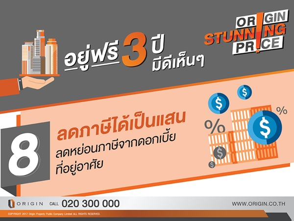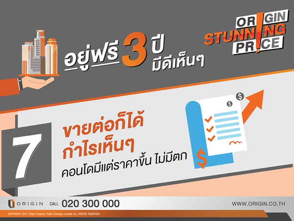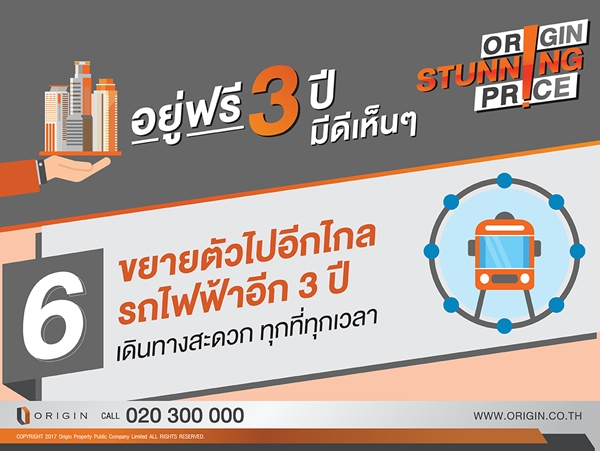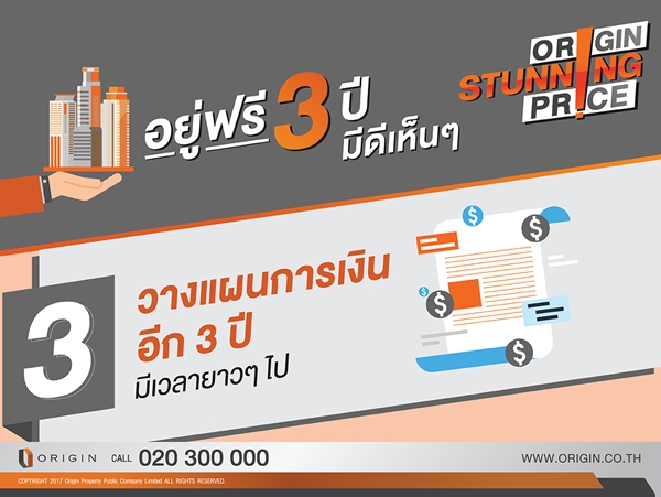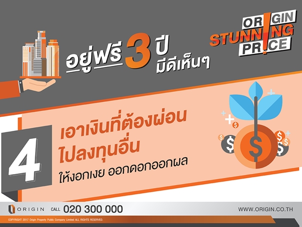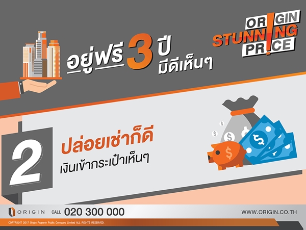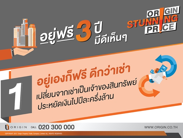 ออริจิ้น มอบโอกาสเดียวกับข้อเสนอที่ดีที่สุด คอนโดแนวรถไฟฟ้ากว่า 10 โครงการ แต่งครบพร้อมอยู่ฟรี 3 ปี ALL FREE เพียงคุณจอง Origin ผ่อนให้ อยู่ฟรี 3 ปี (เริ่มผ่อนปีที่ 4) พบกัน 17 - 20 สิงหาคมนี้ ที่พารากอน และศูนย์ประชุมสิริกิติ์ ลงทะเบียนรับสิทธิพิเศษวันนี้ - 20 สิงหาคม นี้เท่านั้น (เพียง 50 ห้องเท่านั้น)ท่านใดที่สนใจสามารถลงทะเบียนได้ที่นี่ALL FREE เพียงคุณจอง Origin ผ่อนให้ อยู่ฟรี 3 ปี (เริ่มผ่อนปีที่ 4)- ฟรีทุกค่าใช้จ่ายวันโอน