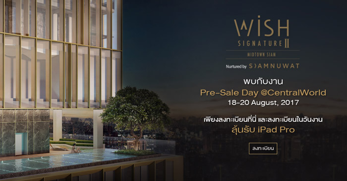 วิช ซิกเนเจอร์ 2 มิดทาวน์ สยาม (Wish Signature II Midtown Siam) คอนโด Luxury Modern ย่าน Midtown Siam พบกับงาน Pre-Sales วันที่ 18-20 สิงหาคมนี้ ที่ลานอีเดน 1 ศูนย์การค้าเซ็นทรัลเวิลด์ และพบสิทธิพิเศษต่างๆ มากมาย อาทิ