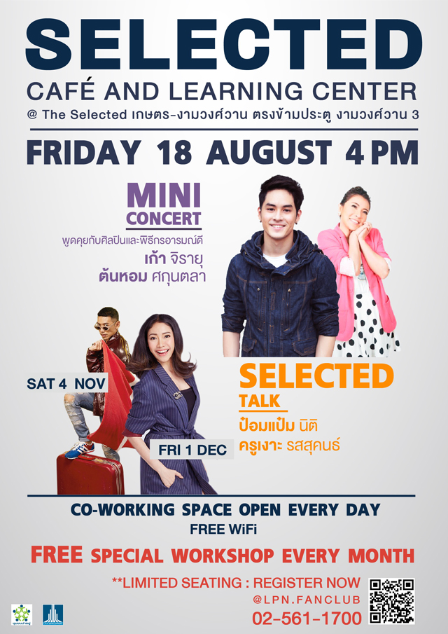 "Selected Cafe And Learning Center" เพื่อเปิดประสบการณ์แห่งการเรียนรู้สำหรับคนรุ่นใหม่ ทั้งนักศึกษาและประชาชนทั่วไป โดยปรับพื้นที่ให้เป็น Co-Working Space และเปิดหลักสูตร Workshop ต่างๆ มากมาย อาทิ English Language & Communication, Japanese For Travellers, Workshop วาดภาพสีน้ำและ Workshop เพื่อสุขภาพจาก สสส. รวมทั้งเสวนาดีๆ จากนักสร้างแรงบันดาลใจชื่อดัง ทั้งป๋อมแป๋ม นิติ ชัยชิตาทร พิธีกร นักเขียน นักแสดงหัวข้อ "เลือกรักให้โดนใจ" และครูเงาะ รสสุคนธ์ กองเกตุ Acting Coach อันดับ 1 ของเมืองไทย หัวข้อ "เลือก LIFE ให้ SUCCESS"