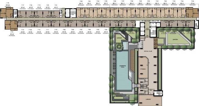 - ห้องมี 3 แบบหลักๆ คือ ห้องสตูดิโอ (21 ตร.ม.) 1 ห้องนอน (30 ตร.ม.) และ 2 ห้องนอน 45 (ตร.ม.) ตามรูปข้างล่าง