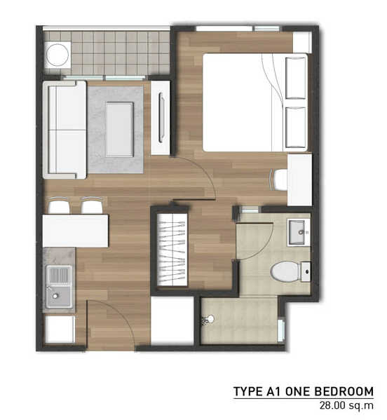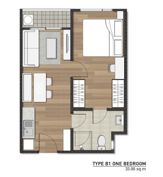 Floor Plan ชั้น 2 - 7 แบบห้อง และพื้นที่ใช้สอย - แบบ 1 ห้องนอน ขนาดพื้นที่ใช้สอย 28 ตร.ม. และ 33 ตร.ม.