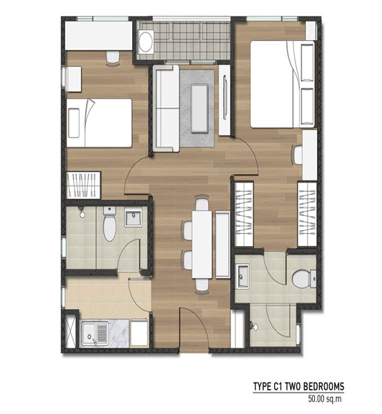 - แบบ 2 ห้องนอน ขนาดพื้นที่ใช้สอย 50 ตร.ม.