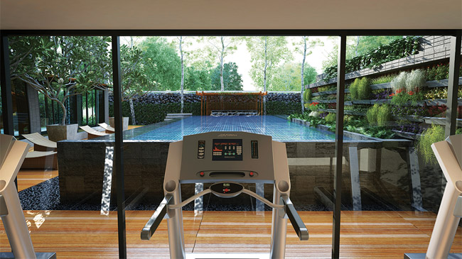 ภาพจำลองบรรยากาศห้องฟิตเนส มองเห็นวิวสระว่ายน้ำ และสวนสไตล์ tropical