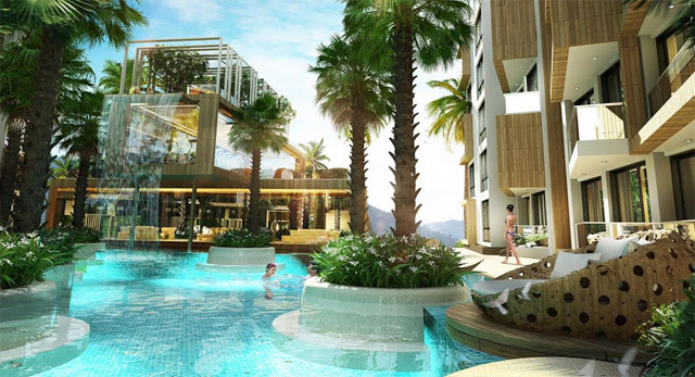- สระว่ายน้ำสไตล์สวนเมืองร้อน จากุซซี่ และสระว่ายน้ำเด็ก
