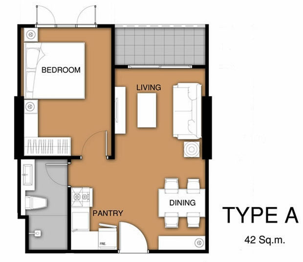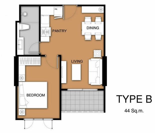 แบบห้องและพื้นที่ใช้สอย - 1 ห้องนอน ขนาด 42 และ 44 ตารางเมตร