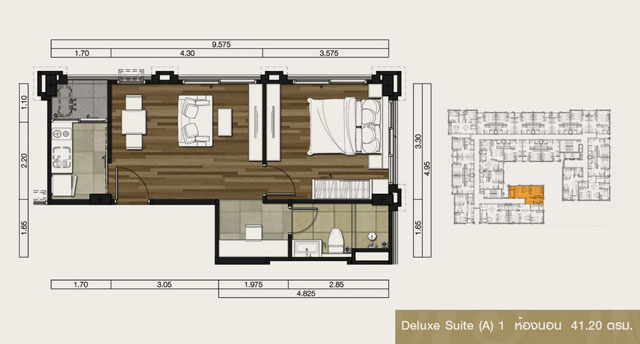 - แบบ Deluxe Suite (DS) 1 ห้องนอน พื้นที่ใช้สอยขนาดตั้งแต่ 41.20 - 44.60 ตร.ม.