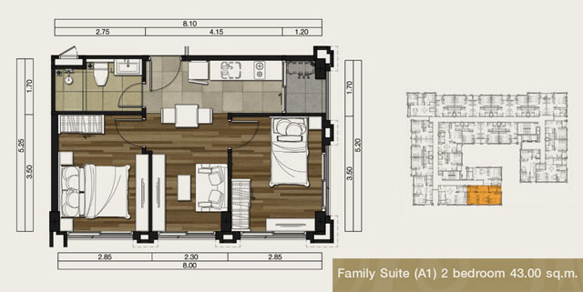 - แบบ Family Suite (FS) 2 ห้องนอน พื้นที่ใช้สอยขนาดตั้งแต่ 43 - 55 ตร.ม.