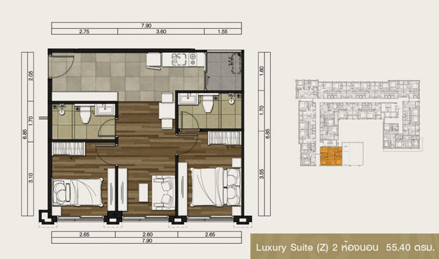- แบบ Luxury Suite (LS) 2 ห้องนอน พื้นที่ใช้สอยขนาดตั้งแต่ 53.50 - 55.40 ตร.ม.