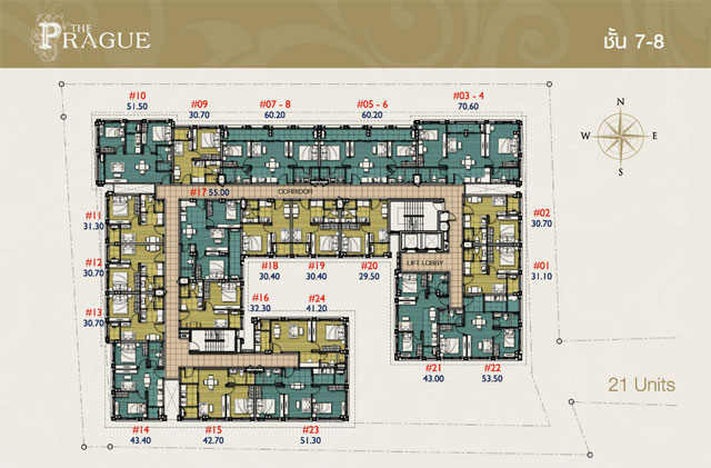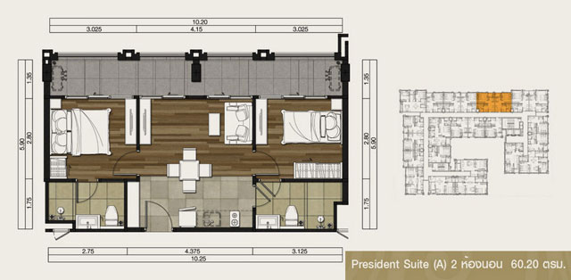 - แบบ President Suite (PS) 2 ห้องนอน พื้นที่ใช้สอยขนาดตั้งแต่ 60.20 - 70.60 ตร.ม.