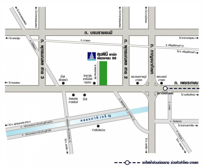 แผนที่โครงการ ลุมพินี พาร์ค เพชรเกษม 98 รูปแบบคอนโด และขนาดพื้นที่โครงการ - คอนโดมิเนียมเป็นแบบ High-Rise จำนวน 4 อาคาร ( อาคาร A,D สูง 20 ชั้น และ อาคาร B,C สูง 21 ชั้น)