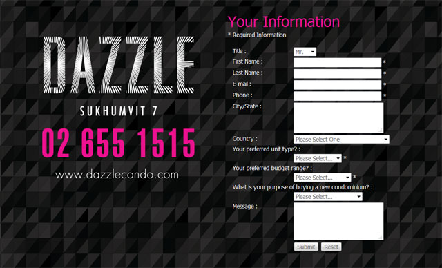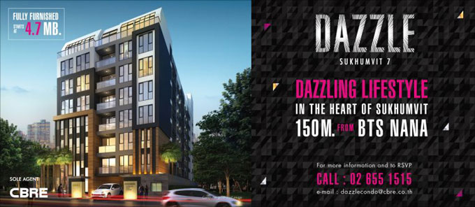แดซเซิล สุขุมวิท 7 (Dazzle Sukhumvit 7) ใกล้รถไฟฟ้าสถานีนานา โดยเริ่มเปิดให้จองตั้งแต่วันเสาร์-อาทิตย์ ที่ 28 และ 29 มิถุนายนที่ผ่านมา ด้วยแบบห้องเริ่มต้นไซส์เล็กสุด 1 Bedroom ขนาด 36 ตร.ม. และไซส์ใหญ่สุด 2 Bedroom (ห้องมุม) ขนาด 70 ตร.ม. การันตีด้วยคุณภาพวัสดุภายในที่คัดเกรดอย่างดี