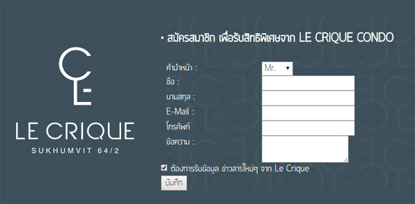 โครงการ เลอ ครีก สุขุมวิท 64/2 (Le Crique Sukhumvit 64/2) เริ่มเปิด Pre-sale มาตั้งแต่ปลายเดือนมีนาคม 2558 ที่ผ่านมา โดยมียอดขายไปแล้วประมาณ 30% ซึ่งปัจจุบันราคาเริ่มต้นปรับขึ้นมาจากตอน Pre-sale เล็กน้อย จากราคา 2.25 ล้านบาท ขยับมาเริ่มต้นอยู่ที่ 2.5 ล้านบาท โดยโครงการจะเริ่มก่อสร้างประมาณเดือนสิงหาคม 2558 และคาดว่าจะก่อสร้างแล้วเสร็จพร้อมให้ลูกค้าเข้าอยู่ได้ประมาณเดือนธันวาคม 2559 สำหรับผู้ที่สนใจสามารถลงทะเบียนเพื่อรับข้อมูลข่าวสาร และสิทธิพิเศษจากทางโครงการได้ที่เว็บไซต์โครงการ หรือคลิกลงทะเบียนด้านล่างนี้ค่ะ