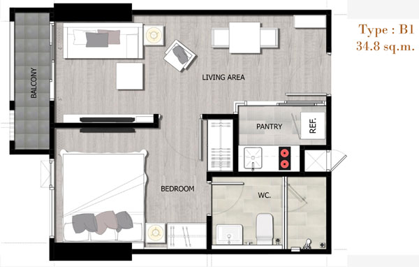 Unit Plan ห้องแบบ 1 ห้องนอนขนาด 34.80 ตร.ม.
