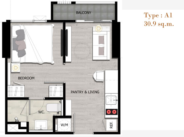Unit Plan ห้องแบบ 1 ห้องนอนขนาด 30.90 ตร.ม.