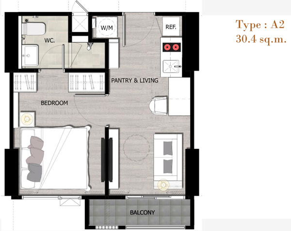 Unit Plan ห้องแบบ 1 ห้องนอนขนาด 30.40 ตร.ม.