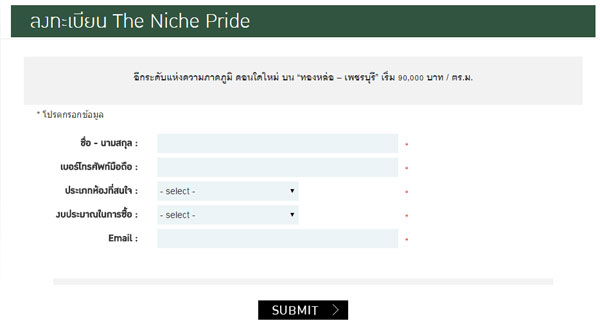 โครงการ เดอะนิช ไพร์ด ทองหล่อ-เพชรบุรี ยังไม่มีกำหนดเปิดตัวอย่างเป็นทางการ โดยตัวโครงการอยู่ระหว่างการขอ EIA คาดว่าจะเริ่มก่อสร้างประมาณเดือน ก.ย. 58 และจะก่อสร้างแล้วเสร็จประมาณเดือน ก.ย. 60 นี้ สำหรับลูกค้าที่สนใจสามารถเข้าไปลงทะเบียนรับส่วนลดพิเศษได้ที่เว็บไซต์ของโครงการ หรือคลิกลงทะเบียนที่ลิงก์ด้านล่างนี้