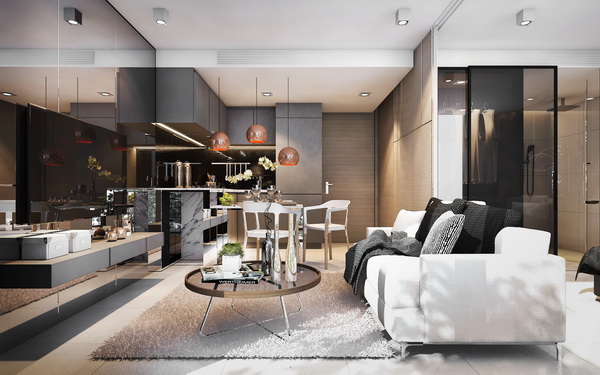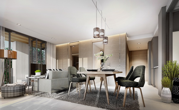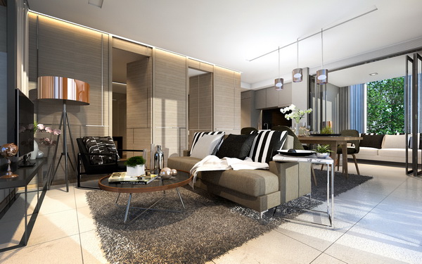 ห้องพักออกแบบตกแต่งในสไตล์โมเดิร์น เน้นสีเอิร์ธโทน และสีวัสดุจากธรรมชาติ อย่างสีขาว เทา น้ำตาล และดำ ให้ความสำคัญกับพื้นที่ส่วนกลาง มีให้หลายขนาดให้เลือก - แบบ 1 ห้องนอน พื้นที่ใช้สอยขนาด 29.20 - 35.80 ตร.ม.