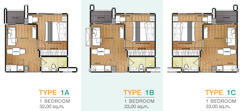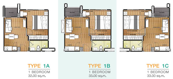 ห้องพักอาศัยแบบ 1 ห้องนอน พื้นที่ใช้สอยขนาด 32 - 33 ตร.ม. ตกแต่งด้วยเฟอร์นิเจอร์ครบพร้อมเข้าอยู่ แบ่งออกเป็น 3 Type ด้วยกัน