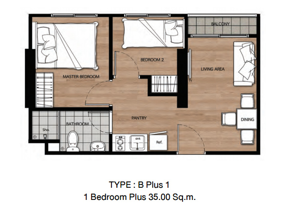 - แบบ 1 ห้องนอน Type Bplus 1 ขนาดพื้นที่ใช้สอย 35.00 ตร.ม.