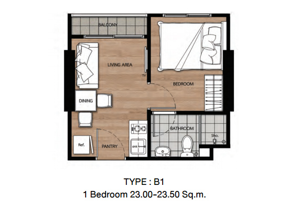 - แบบ 1 ห้องนอน Type B1 ขนาดพื้นที่ใช้สอย 23.00-23.50 ตร.ม.