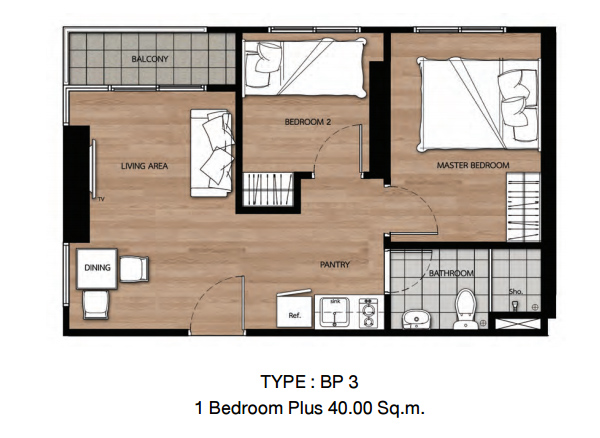 - แบบ 1 ห้องนอน Type Bplus 3 ขนาดพื้นที่ใช้สอย 40.00 ตร.ม.