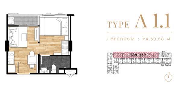 Unit Plan Type A1.1 แบบ 1 ห้องนอน ขนาด 24.60 ตร.ม.