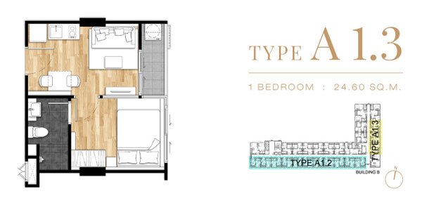 Unit Plan Type A1.3 แบบ 1 ห้องนอน ขนาด 24.60 ตร.ม.