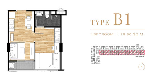 Unit Plan Type B1 แบบ 1 ห้องนอน ขนาด 29.80 ตร.ม.