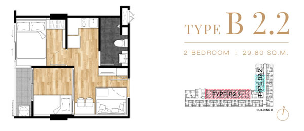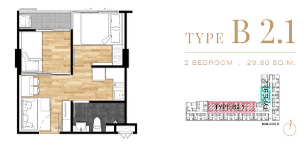 Unit Plan Type B2.1 แบบ 2 ห้องนอน ขนาด 29.80 ตร.ม.