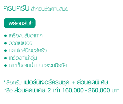 โครงการเปิดจอง วันที่ 29-31 ก.ค.นี้ พร้อมโปรโมชั่นน่าสนใจอย่าง ฟรีแอร์, วอลล์เปเปอร์, ชุดเฟอร์นิเจอร์ครัว, เครื่องทำน้ำอุ่น และกระจกกั้นอาบน้ำแบบกระจกนิรภัย หรือเลือกรับส่วนลดกว่า 260,000 บาท