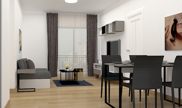 ภาพจำลองบรรยากาศห้องนั่งเล่นที่เชื่อมต่อกับโต๊ะทานข้าว