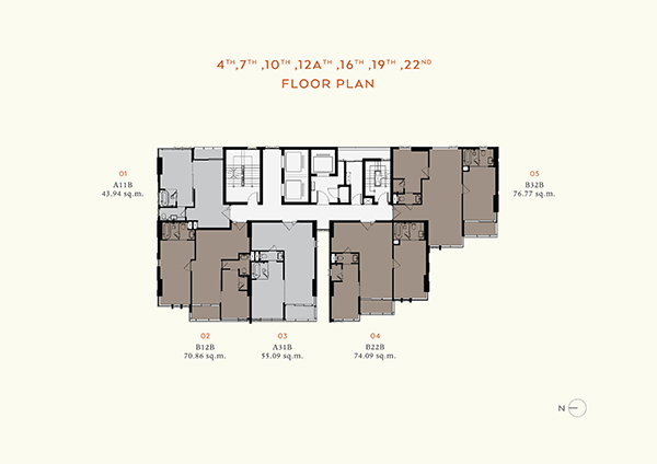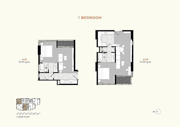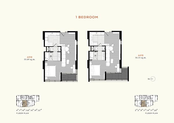 - 1 ห้องนอน ขนาดพื้นที่ประมาณ 43.94-58.15 ตารางเมตร