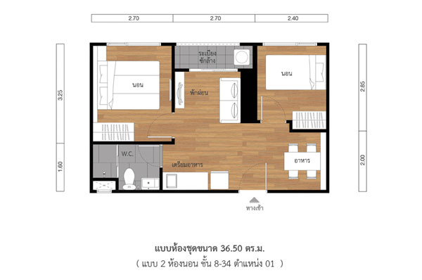 - แบบ 2 Bedroom พื้นที่ใช้สอยขนาด 36.00 ตร.ม.