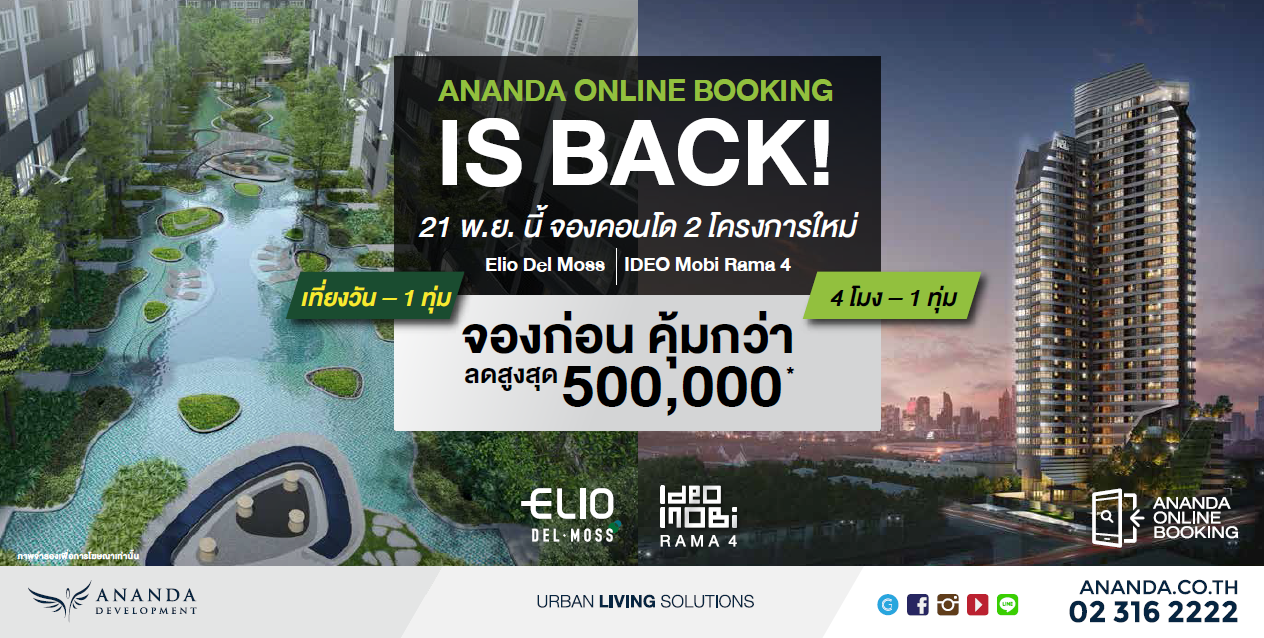 Ananda Online Booking is Back! จองคอนโดผ่านออนไลน์ 2 โครงการใหม่ Elio Del Moss และ IDEO Mobi Rama 4 จองก่อนคุ้มกว่า ลดสูงสุด 500,000 บาท