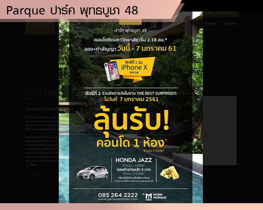 โปร : จองพร้อมทำสัญญา รับทองคำหนัก 1 บาท*, iPhone X 64 GB* 1 เครื่อง และรางวัลอื่นๆ อีกมากมาย ***ร่วมชิงรางวัลในงาน The Best Surprise 7 มกราคม 2561 ลุ้นรับคอนโด 1 ห้อง* 1 รางวัล*, Honda Jazz 1 รางวัล* และทองคำแท่งหนัก 5 บาท*