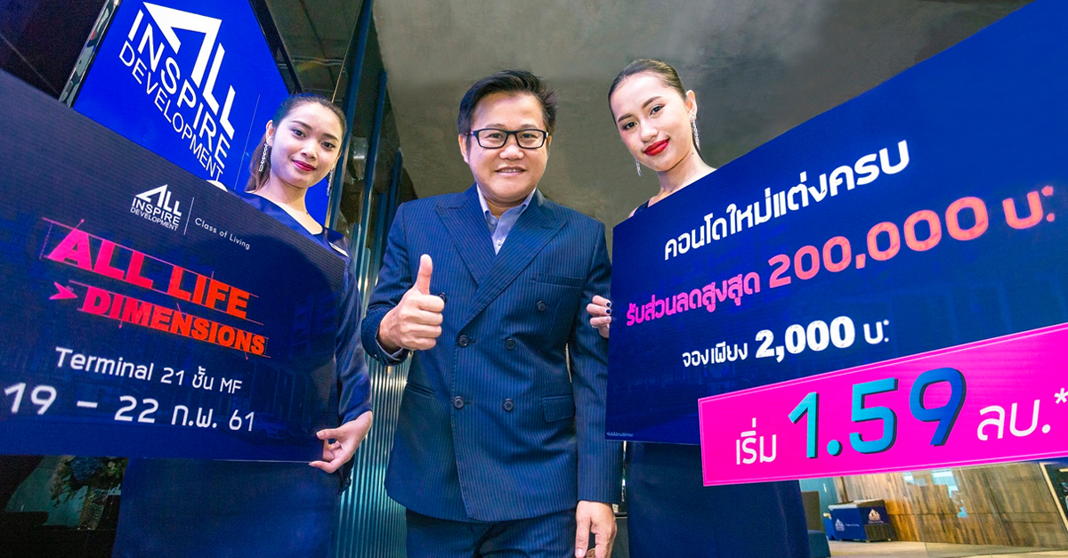 คุณธนากร ธนวริทธิ์ ประธานเจ้าหน้าที่บริหาร บริษัท ออลล์ อินสไปร์ ดีเวลลอปเม้นท์ จำกัด (มหาชน) เตรียมส่งแคมเปญพิเศษ "All Life Dimensions" นำ 6 คอนโดมิเนียมคุณภาพเยี่ยมใกล้สถานีรถไฟฟ้า และถนนใหญ่สู่ใจกลางเมือง ภายใต้แบรนด์คุณภาพ อาทิ โครงการ ดิ เอ็กเซล กรูฟ เฟส 3 บนทำเลที่ดีที่สุดติดถนนสุขุมวิท 105, ดิ เอ็กเซล อุดมสุข, ไรส์ พระราม 9, ดิ เอ็กเซล ไฮด์อะเวย์ สุขุมวิท 50, ดิ เอ็กเซล ไฮด์อะเวย์ สุขุมวิท 71 และ ดิ เอ็กเซล ไฮด์อะเวย์ รัชดา - ห้วยขวาง พร้อมข้อเสนอพิเศษสุดกับ "จองเพียง 2,000 บาท ส่วนลดสูงสุดกว่า 200,000 บาท พร้อมแต่งครบ" ในราคาเริ่มต้น 1.59 ล้าน* พบกับข้อเสนอพิเศษสุดได้ ในวันที่ 19 - 22 ก.พ. นี้ ณ Terminal 21 ชั้น MF (ทางเชื่อม BTS สถานี อโศก)