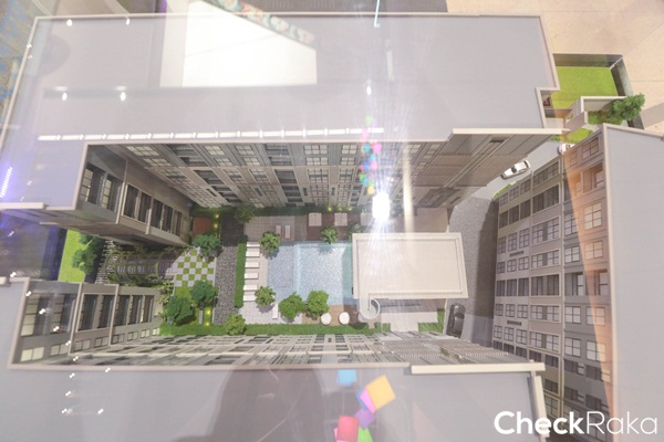 จะเห็นว่าออกแบบให้อาคารพักอาศัยโอบล้อมพื้นที่ส่วนกลางและสระว่ายน้ำสไตล์ยุโรป ทำให้ได้ความเป็นส่วนตัว