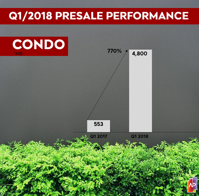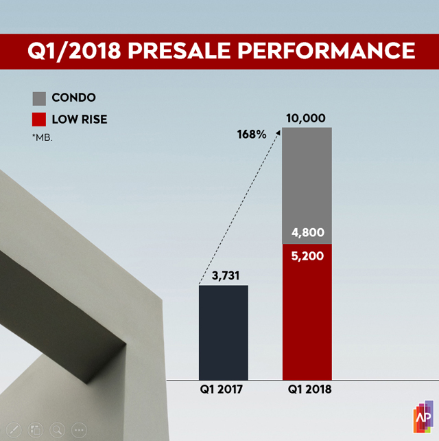 บริษัท เอพี (ไทยแลนด์) จำกัด (มหาชน) ผู้นำด้านการพัฒนาโครงการอสังหาริมทรัพย์ของประเทศไทย เปิดเผยตัวเลขยอดขายไตรมาส 1 ณ วันที่ 31 มีนาคม 2561 สร้างยอดขายได้แล้วถึง 10,000 ล้านบาท เติบโตจากช่วงเวลาเดียวกันของปีที่ผ่านมาถึง 168% โดยสินค้าแนวราบเติบโตสูงถึง 64% หรือเท่ากับ 5,200 ล้านบาท และคอนโดมิเนียมโตถึง 770% หรือเท่ากับ 4,800 ล้านบาท ส่งผลให้บริษัทฯ สามารถสร้างยอดขายได้แล้ว 30% ของเป้ายอดขาย ปี 2561 ที่ตั้งไว้ (เป้ายอดขาย 33,500 ล้านบาท)