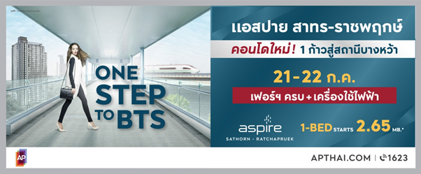 ไปพิสูจน์พร้อมสัมผัสประสบการณ์จริง "เปิดคอนโดใหม่ ASPIRE สาทร-ราชพฤกษ์" เพียง 1 ก้าวจากรถไฟฟ้า BTS & MRT บางหว้า อินเตอร์เชนจ์ 21- 22 กรกฎาคม 2561 นี้ 1 ห้องนอน เริ่มต้น 2.65 ล้านบาท พิเศษโปรโมชั่นในงาน ฟรีเฟอร์นิเจอร์ครบและเครื่องใช้ไฟฟ้า พร้อมเข้าอยู่ปลายปีนี้