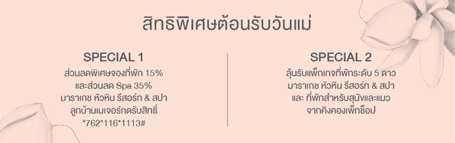 Special ที่ 2 ลุ้นรับแพ็กเกจที่พักฟรี! มาราเกช หัวหิน รีสอร์ท แอนด์ สปา 2 วัน 1 คืน มูลค่ารางวัลละ 5,000 บาท จำนวน 2 รางวัล และเอาใจคนรักสัตว์เลี้ยง ลุ้นรับรางวัลที่พักโรงแรมบริการรับฝากน้องหมาน้องแมว 3 วัน 2 คืน จำนวน 8 รางวัล จากคิงคองเพ็ทช็อป ให้ไปเที่ยวชิลๆ แบบหมดห่วง ร่วมสนุกง่ายๆ กับกิจกรรมบอกรักแม่ที่ใครๆ ก็ลุ้นได้ เพียงแชร์ประสบการณ์ความรักความประทับใจที่มีต่อแม่ในเฟสบุ๊คเพจ