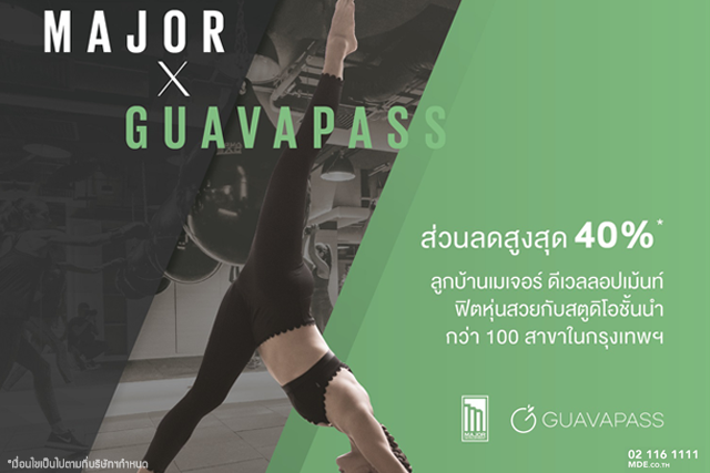 สำหรับลูกบ้านเมเจอร์เพียง 1,119 บาท กด *762*116*1111# เพื่อรับรหัสก่อนการใช้สิทธิ์ เมื่อรับสิทธิ์แล้ว สามารถซื้อแพ็คเกจออกกำลังกายได้ผ่านแอปพลิเคชัน GuavaPass หรือเว็บไซต์