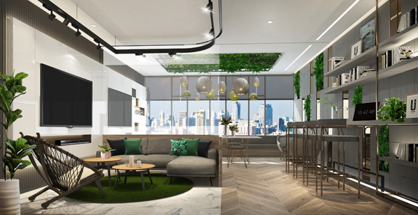 ภาพบรรยากาศภายในอาคารบริเวณ Co Working Space ที่ประกอบด้วย Entertainment Area และ Library Corner