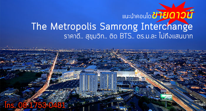 เดอะ เมโทรโพลิส สำโรง อินเตอร์เชนจ์ (The Metropolis Samrong Interchange) นั้นเอง เพราะราคาขายดาวน์ตอนนี้เรียกว่าไม่ถึง 100,000 บ./ตร.ม. ทั้งๆ ที่ตัวโครงการอยู่ติดรถไฟฟ้า (BTS สถานีสำโรง) ตอนนี้เรามี 20 ยูนิตพิเศษจากเจ้าของที่พร้อมจะขายดาวน์ก่อนโอนกรรมสิทธิ์ด้วยในราคาเรียกได้ว่าเอากำไรน้อยมาก (ขายโดยเจ้าของตรงไม่ผ่านนายหน้า และไม่มีค่านายหน้า) ตัวอย่างเช่น