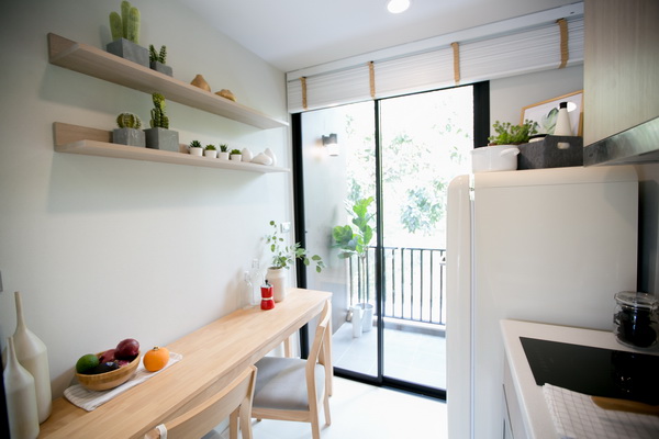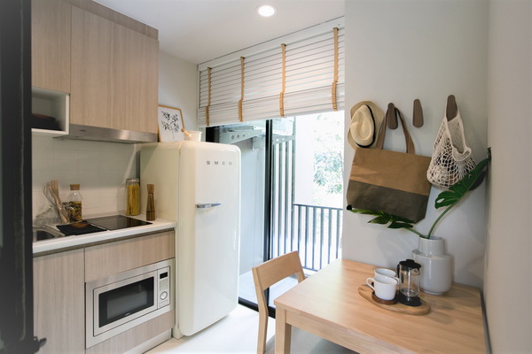ห้องแบบ 1 ห้องนอน (CO-MMON) ขนาด 26 ตร.ม. นิยามของพื้นที่ขนาดกะทัดรัด การใช้ชีวิตที่ตั้งอยู่บนพื้นฐานของความเรียบง่าย แต่พร้อมไปด้วยฟังก์ชันการใช้ชีวิตที่ครบครัน พร้อมเป็น Comfort Zone มีจุดที่น่าสนใจคือ ห้องครัวและโต๊ะอาหารอยู่ด้านนอกริมระเบียง เพื่อขจัดปัญหาเรื่องกลิ่น แต่เป็นจุดที่อากาศถ่ายเท ที่สำคัญจะมองเห็นบรรยากาศวิวด้านนอก เพิ่มความชิลล์ได้อีกด้วย