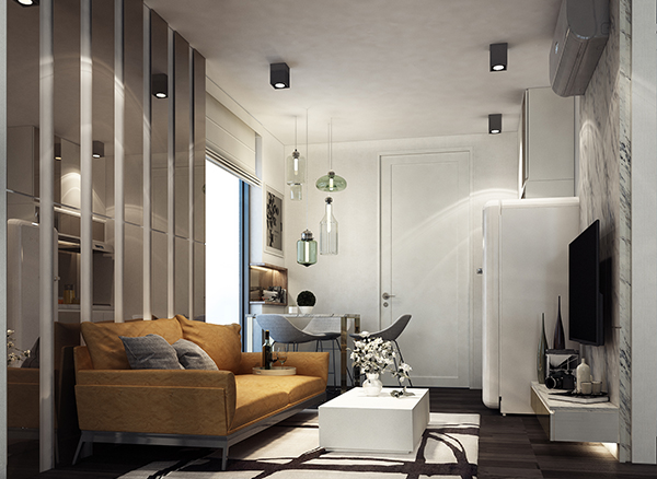 ภาพจำลองห้องตัวอย่างภายในห้องพักอาศัยขนาด 28 ตร.ม. บริเวณห้องนั่งเล่น