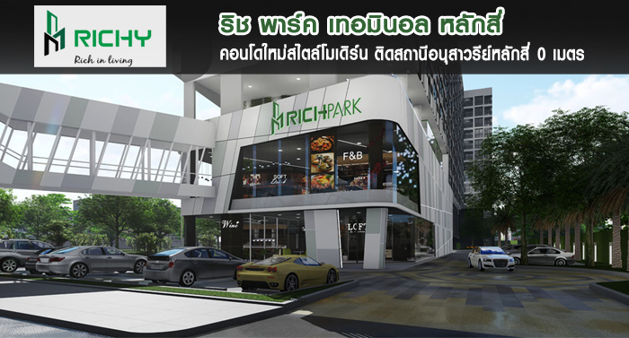 ริช พาร์ค เทอมินอล หลักสี่ (Rich Park Terminal Laksi) คอนโดใหม่ ติดรถไฟฟ้า BTS สถานีอนุสาวรีย์หลักสี่ ออกแบบในสไตล์ Modern Hybrid เป็นคอนโดแบบ High-rise สุดชิค ที่รวมความสุขและสบายแบบ 360 องศา ไฮไลท์ด้วย Sky Walk เชื่อมกับ Community Mall พรั่งพร้อมด้วยสระว่ายน้ำที่ทอดตัวขนานกับรถไฟฟ้า, Fitness, Co-Working Space, Jogging Track ที่จะขยายปอดของท่านด้วยความยาว 200 เมตร