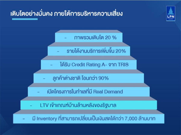 เติบโตได้อย่างยั่งยืนโดยตั้งเป้าหมายไว้ที่ 10% ด้วยการเปิดตัวโครงการให้ครอบคลุมทั้งกลุ่ม Value และ Standard เพื่อกระจายความเสี่ยง ในขณะเดียวกันก็ระมัดระวังในการเลือกทำเลเปิดตัวโครงการใหม่ คาดว่าจะเปิดโครงการใหม่ 15 โครงการ แบ่งเป็น โครงการคอนโดมิเนียม 5 โครงการ มูลค่า 12,000 ล้านบาท และโครงการแนวราบ 10 โครงการ มูลค่า 8,000 ล้านบาท บริษัทยังมีสภาพคล่องอยู่ในระดับสูง เนื่องจากสินค้าพร้อมอยู่ทั้งหมดของ LPN มูลค่ากว่า 7,000 ล้านบาท เป็นสินค้าที่ไม่มีภาระทางด้านการเงิน นอกจากนั้น บริษัทได้รับการจัดอันดับจาก TRIS Rating ในระดับ A- (Stable) ที่แสดงถึงความมั่นคง และน่าเชื่อถือทางการเงินซึ่งจะเป็นประโยชน์ต่อการระดมทุนหากบริษัทมีการออกหุ้นกู้ในอนาคต